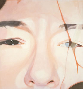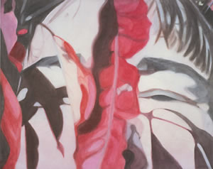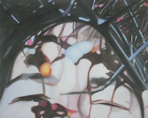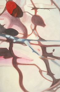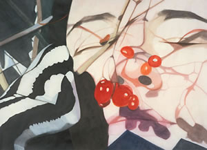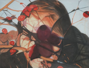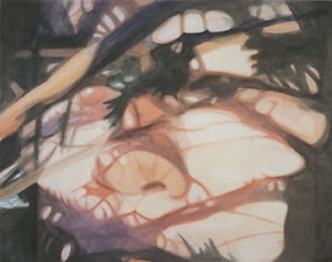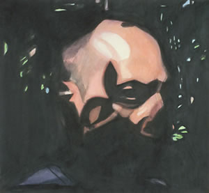 Through her extraordinarily assured paintings, Ulla Maibaum invites us into her mysterious and vaguely disturbing cinematic world. Faces are veiled, and sliced by vegetation or otherwise hidden from view. Her characters seem to be lost in a private Edenic reverie or the void of an existential forest.